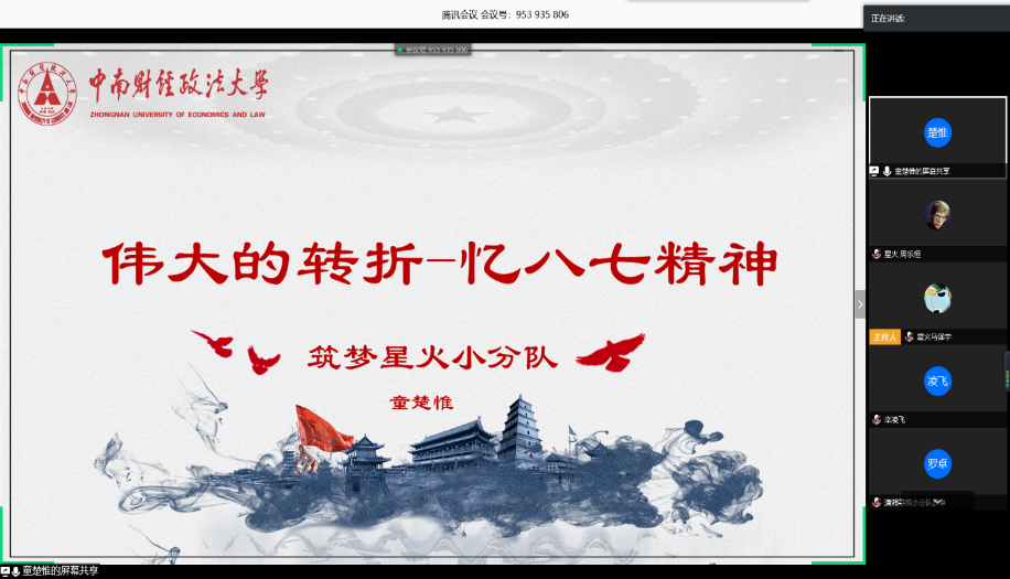 人们对红色文化的认同总是相似的,来自筑梦星火分队的第二位选手童楚惟讲述的是武汉的八七精神,选手主要从党的光荣历史出发,向听众展示了中国共产党为民族解放所做的艰辛努力,追缅先烈,莫忘历史。值此疫情期间,正是党发挥了制度优势、带领人民看见了胜利的曙光。