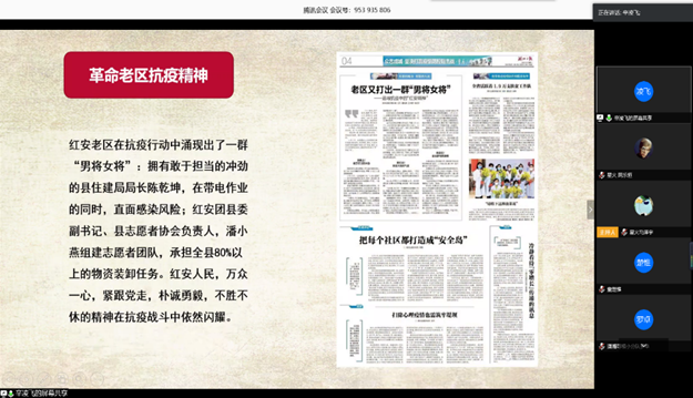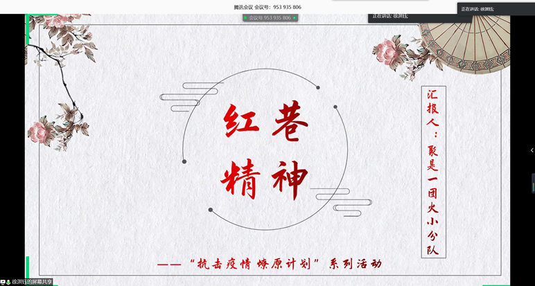 伴随着悠扬的轻音乐,第五个宣讲的是红巷探索分队的主讲人徐淇钰,“两江汇夏口,三镇矗江城。”她娓娓道来江城武汉的红色历史,八七会议、农民运动、中共五大等许多著名事件都发生在武汉这片红色的海洋里。选手结合当前武汉战疫现状,通过视频拍摄,广播剧排练的新颖方式让我们看见了武汉人民众志成城的红巷精神。红巷精神、武汉精神等等,都体现在每一个武汉人身上,在此次战疫中发光发热。