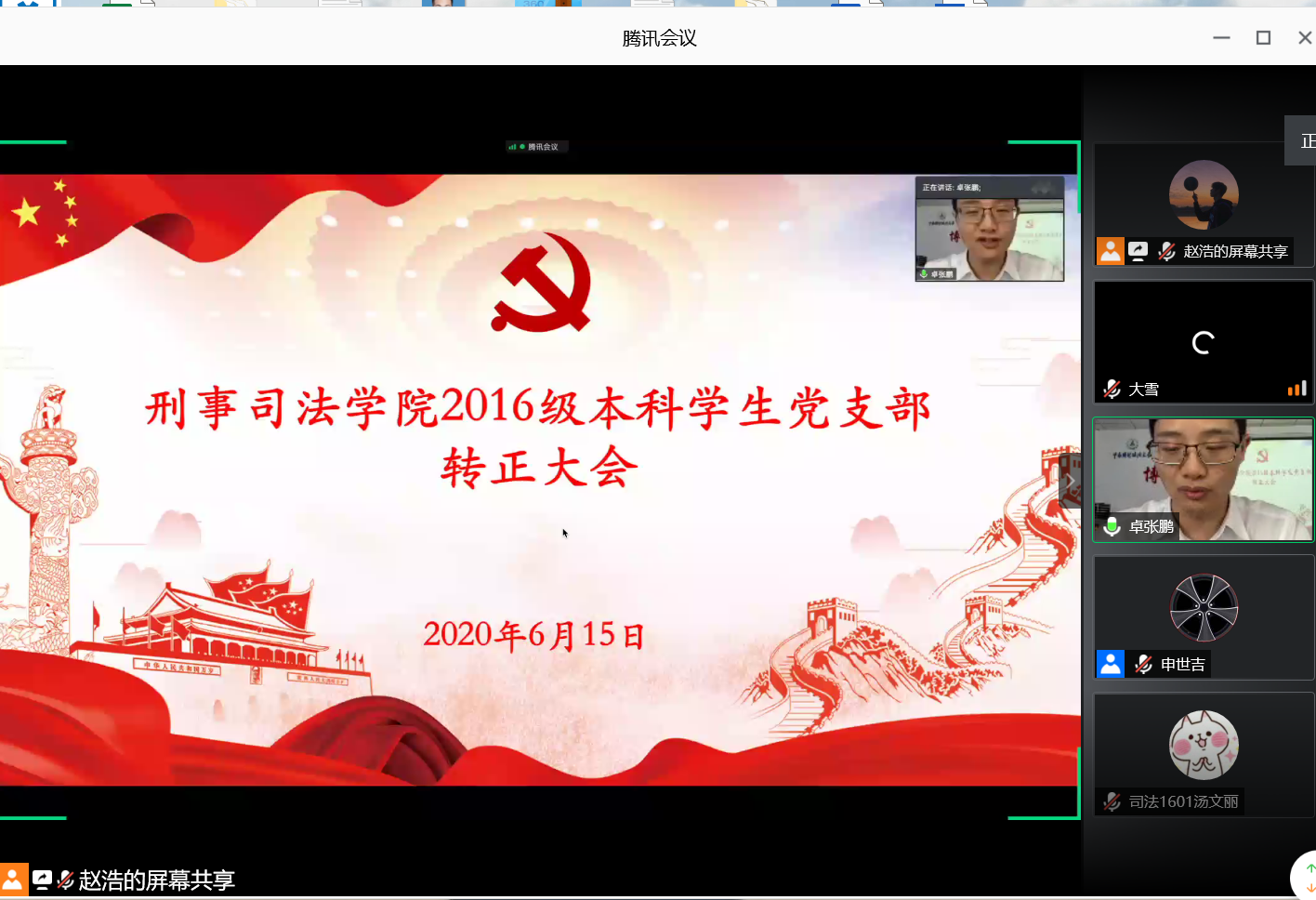 (通讯员 申世吉)6月15日下午3:00, 公司2016级本科员工党支部预备党员转正会议在文治楼二楼会议室以“线上+线下”相结合的方式召开。公司党委副书记万里雪、党政办主任刘宇、辅导员黄文菊、郭青川以及2016级本科员工党支部全体党员参加会议,会议由党支部书记卓张鹏老师主持。