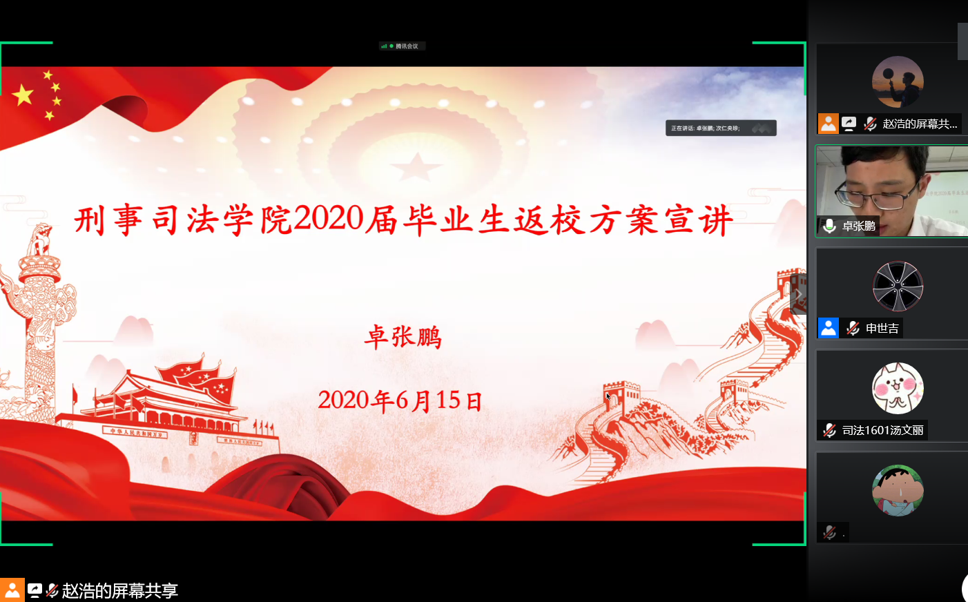 接着,卓张鹏老师从领、寄、礼、管四个方面概括了返校后每位同学所应完成各项工作。会议最后,卓老师回答了同学们提出的各种问题并表达了对同学们的思念,同时他表示会竭尽全力给毕业生们送去温暖,尽可能地使大家此次特殊情况下的毕业不留遗憾。会议至此圆满结束。
