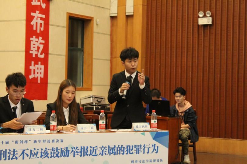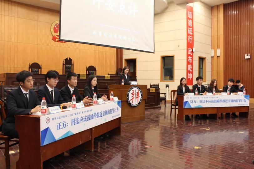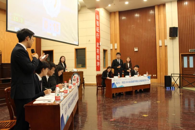 视频结束,双方辩手入席。由贺鑫月、李伟、陈志鹏和成兴鹏组成的正方——鄂鲁苏川队,对战张春晓、张宇豪、朱烨和刘孟坦组成的反方——评委听了都觉得队。辩论开始, 双方针锋相对,为大家奉献了一场精彩绝伦的辩论。在立论环节,正反方一辩分别对己方辩题作出理解与辨析,从辩题本身过渡到传统人文、社会风化、刑侦技术等方方面面,为辩题架构起了一个立体的思考空间。在驳论环节,反方二辩对正方“鼓励亲属举报降低执法成本”提出异议,并从法与刑法本身的性质来引证己方观点,而正方二辩观点新颖,积极拓展刑法概念边界、立足全球刑法体系,对反方引例的客观性提出质疑。双方唇枪舌剑,不相上下。而在最后最激烈的自由辩环节,双方娓娓道来,正方就辩题概念作出深入的探讨与讯问,指出反方对论点移花接木、混淆概念,强调国家信誉的维护,从刑法立法的出发点、社会法治的最高点来度量己方辩题的合理性,反方面对质询临危不乱,连用反问,从刑法对人权、自由权维护的角度来思考维护人情间选择的自主空间。经过立论、驳论、对攻、盘问、自由辩和结辩陈词六个环节的激战,八位辩手妙语连珠、口惊四座,立论深远、见解独到。现场气氛持续升温,观众们也被辩手们激昂热烈的陈词所感染,掌声雷鸣、阵阵叫好。