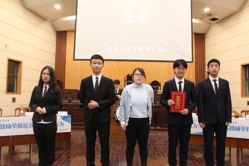 最终,评委投票决定反方“评委听了都觉得队”获得冠军,正方“鄂鲁苏川队”以一票之差惜败,获得亚军。而获得本次比赛季军的队伍是“尽管输了也要亲亲抱抱举高高队”。公安2005班获得最佳组织奖。反方四辩刘孟坦凭借出色的现场表现夺得最佳辩手称号。评委赵正武、刘怡、李家琪、向静蕾为获奖组织及个人颁奖并合影留念。随后,砺剑辩论队历届队长为辩手们举行了受徽仪式,并鼓励他们努力奋进,积极展现刑司优良风貌。最后,参与今晚比赛活动的各位评委与参赛辩手合影留念。