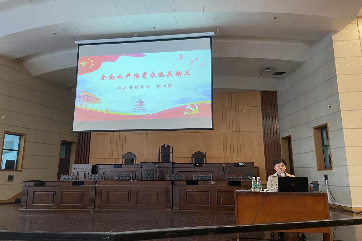 接着,徐双敏教授以《全面从严治党永远在路上》为题进行了授课,徐教授从全面从严治党的要求、为什么要全面从严治党、为什么要长期坚持全面从严治党三个方面向我们强调了从严治党的重要性。她指出中国共产党人数现在已有9000多万人,从严治党是必须的也是迫切的工作目标。她用我国抗疫经验以及苏联末期党内现状等实例向我们表明,从严治党的确能提升国家战斗力。她还指出,面对新时代,从严治党在今天显得更为重要,是实现中国梦的需要,也是我国发展的强大助力。随后,她向我们展示了党的十八大以来我国全面从严治党的举措及成效,对我国的从严治党道路表现出了强大的信心。她希望我们在未来也能坚持全面从严治党,时刻保持党的公正性。