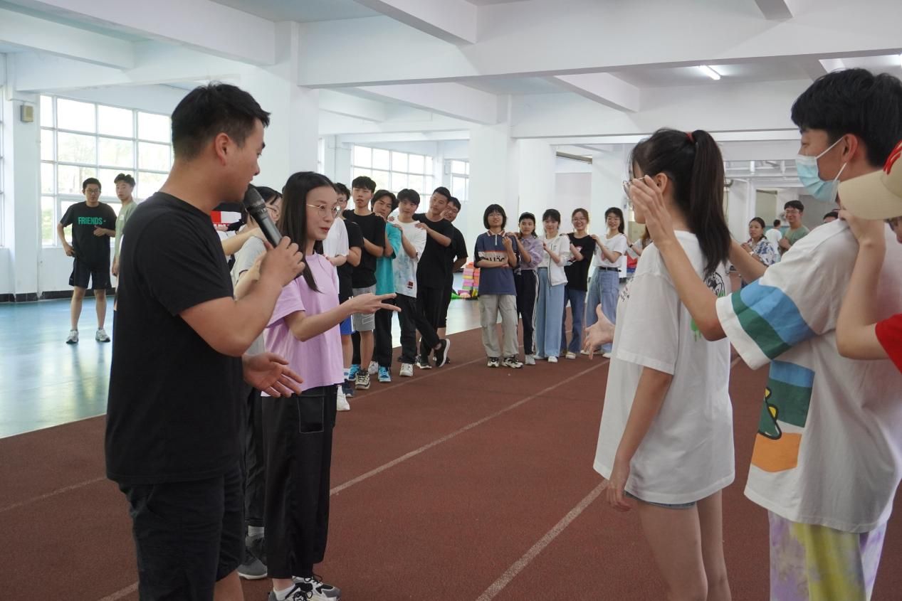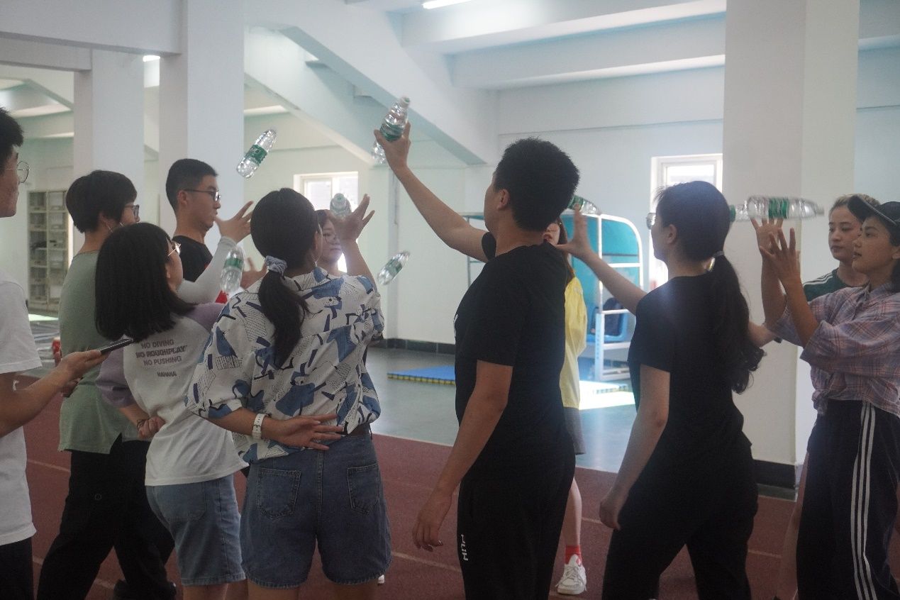 接下来是挑战环节“能量传递”,规则为队伍围成一个圈,每个人把矿泉水瓶不断拋给右边的人,同时接住左边的瓶子,形成一个循环。在连续六次不间断,瓶子不掉落的情况下,视为挑战成功。每队在练习时都非常投入,通过团队协作不断磨合默契。在正式挑战中,第四组以24秒的优异成绩完成了此次挑战,组长在发言时总结了队员站位与拋接的技巧。一个看似简单的游戏其实包含了许多技巧,考验着团队的默契。