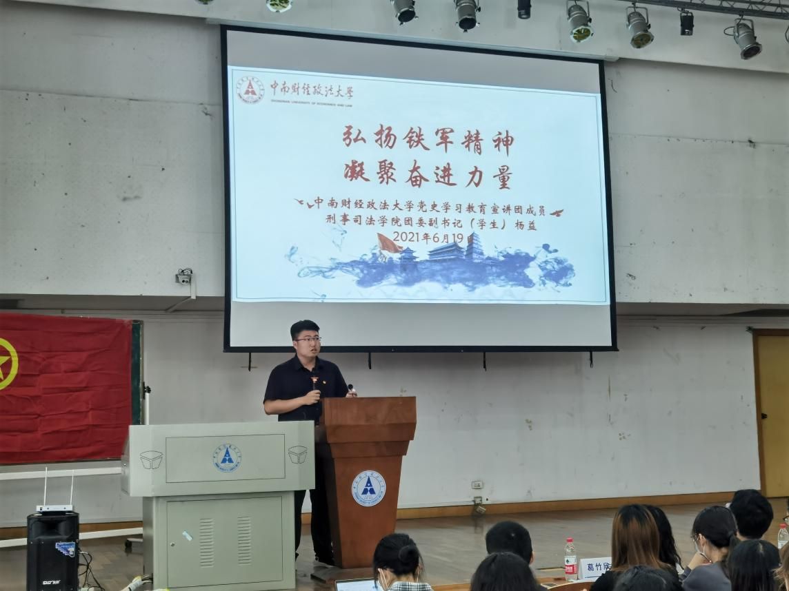 接下来,杨益同学以铁军精神为切入点,向我们讲述了独立团与新四军的羁绊,铁军精神的传承。杨益还向我们阐释了铁军精神的内涵,并以自身的在辩论队、纪律监督部的工作经历分别联想到铁军的担当、斗争、纪律精神,提倡做好学习与工作的权衡,帮助团学骨干们凝聚力量、传承铁军精神,并呼吁广老员工骨干参与到校内外的活动当中,运用各种资源去创新进步,提升创新能力。