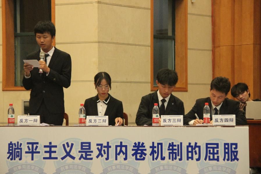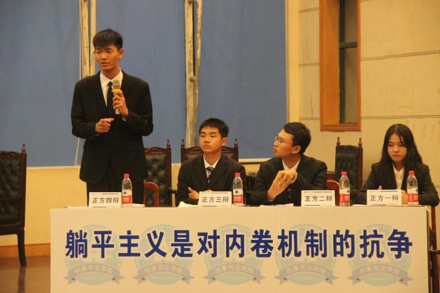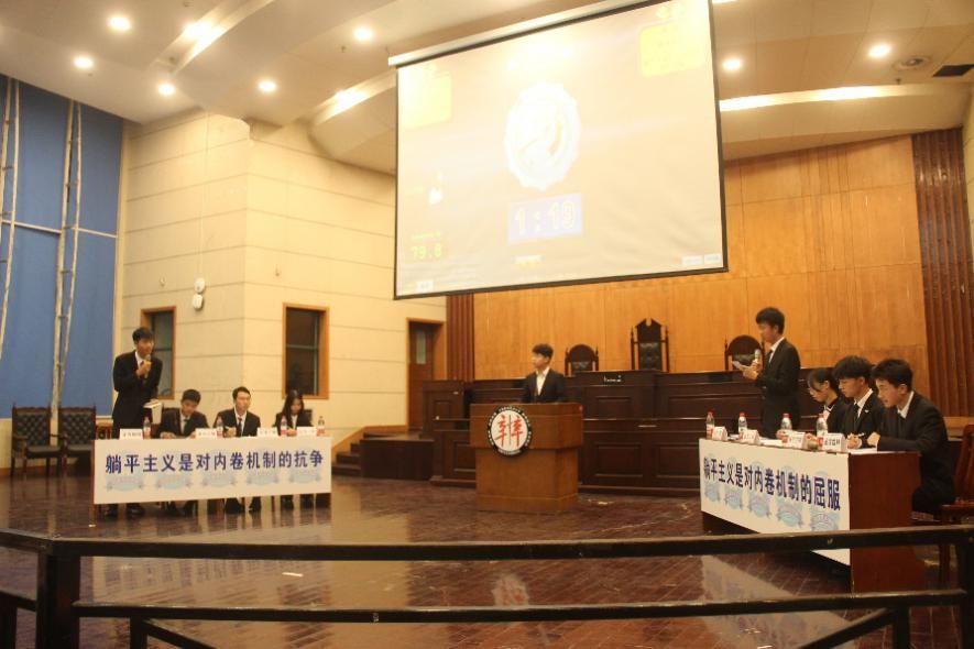 致辞结束,比赛正式开始。此次决赛围绕着“躺平主义”展开辩论。正方持“躺平主义是对内卷机制的抗争”之观点,反方持“躺平主义是对内卷机制的屈服”之观点,双方就此展开了激烈的论战。