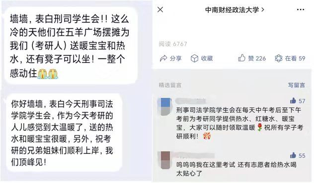 刑司人用爱与坚守筑起地“研”途加油站,也收获了广大在校员工与考生的点赞。步履匆匆的考生路过服务点,总会放慢脚步,或会心微笑,或用手机拍下这份冬日里的温暖,让更多人看到刑司的温情守候。“我在这里考试,还有志愿者给热水喝,太贴心了”“作为今天考研的人儿感到太温暖了”,考试结束后,考生纷纷在网络上对刑司员工会“表白”,相信我们暖心的小举动,一定化作了一束温暖的阳光照耀进他们的心中,成为深刻而难忘的回忆。