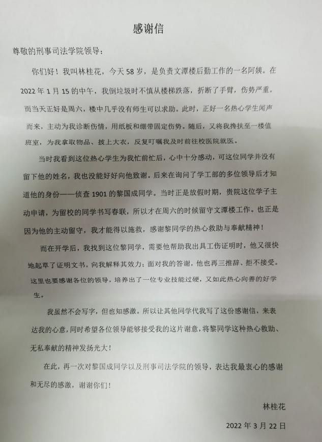 新闻网讯(员工记者 金雯星 喻宇轩 齐敬凯 黄岚 高天乐)3月22日,刑事司法学院收到了一封感谢信,来信者是在公司后勤服务保障中心工作了二十余载的林桂花阿姨,她在信中表达了对学院黎国成同学倾情相助的感谢,赞扬了黎同学热心向善的可贵品质,高度评价了刑司学院对青年的思想道德教育与培养。